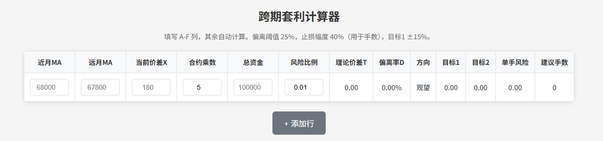 贴心工具:如果你不想手算,可以用我网站上集成的跨期套利计算器,输入近月MA、远月MA、当前价差、合约乘数和总资金,点击自动计算理论中枢、偏离率、方向、目标价、单手风险和建议手数。手机电脑都能用,方便随时查,下面是本站的工具页面